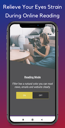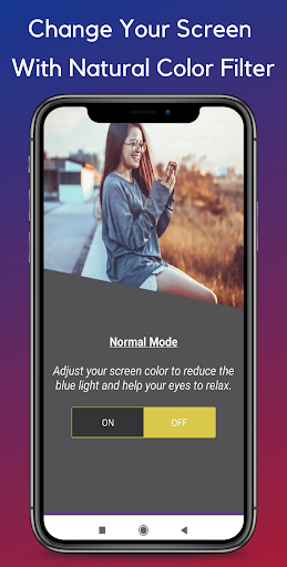 Blue Light Filter is a simple & light weight app which provides simple and useful options to low the brightness of Phone/Tablet. You can select any color you feel comfortable as a various color filter mode. Keep the application running in background.