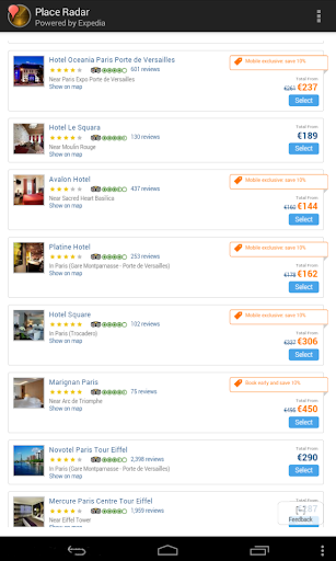 Place Radar is based on Google Maps, making it easy to locate destinations of interest where you can search for cheap hotels, restaurants, theatres and much more. To facilitate planning you can compare and contrast your favourite places and save them for future reference.