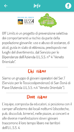 Off Limits è un progetto di prevenzione selettiva dei comportamenti a rischio nella popolazione giovanile: uso e abuso di sostanze, di alcol, guida in stato di ebbrezza. È predisposto nei luoghi del divertimento dal Servizio per le Dipendenze dell’Azienda U.L.S.S.