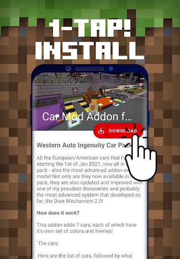 Car Mod for Minecraft PE is a free downloadable content for Minecraft Pocket Edition game, where you can automatically download & install huge collections of Car Automotive Mod to your Minecraft Bedrock world in 1-Tap!
