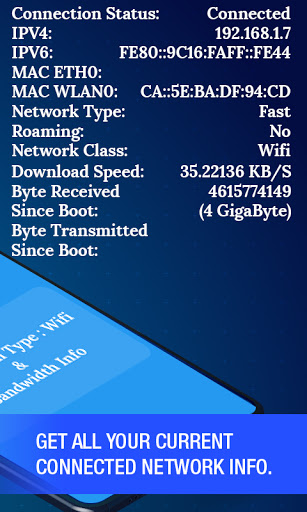 - Bandwidth Info like download speed, byte received since boot, byte transmitted since boot.