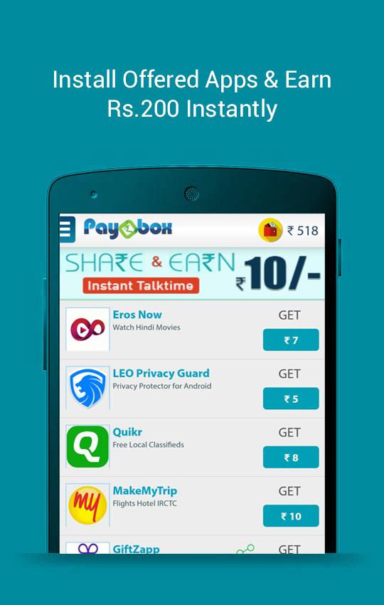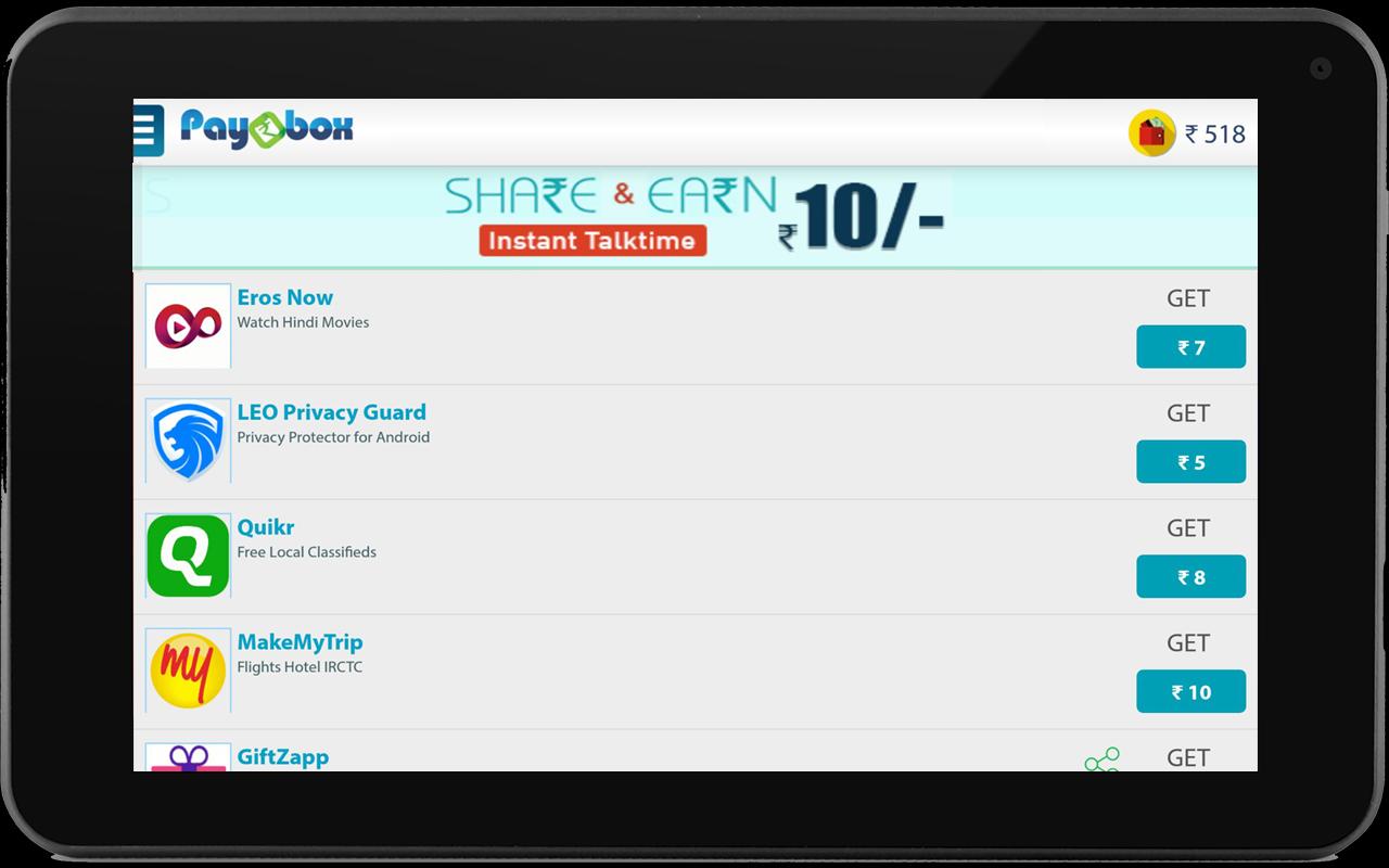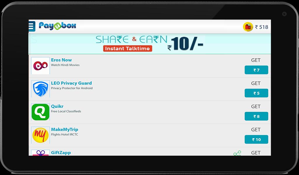 Paybox help you earn free talk time and get free recharge for your mobile. It's fast and simple - Install Paybox App which is also free. Paybox App offers its users free talk time for installing other offer Apps, taking part in contests, watching videos, online registration, playing games etc. Paybox also gives free recharge to its users for inviting your friends to Paybox.