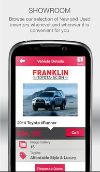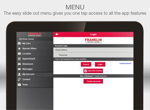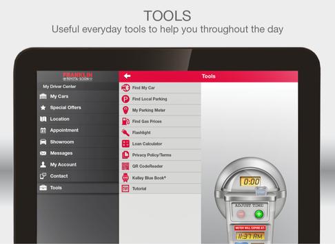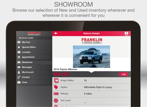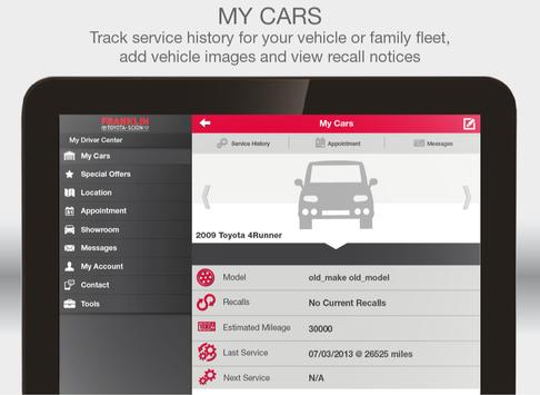 Make your vehicle ownership experience easy with the free Franklin Toyota mobile app. This feature-rich app allows you to get the most out of your vehicle by helping you to maintain and organize essential car details like service history, as well as save money with mobile offers and coupons!