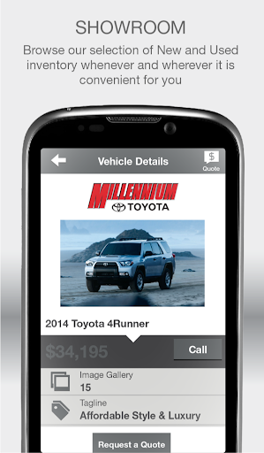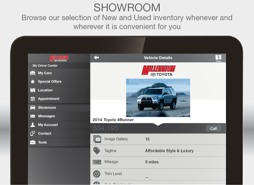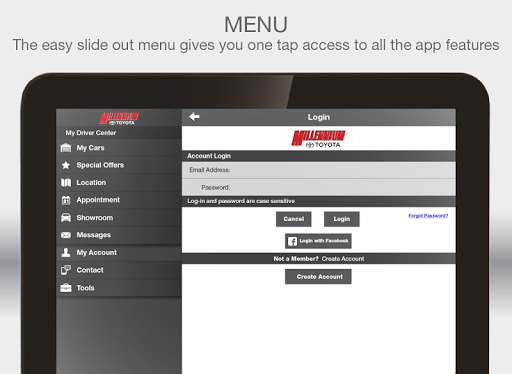 Make your vehicle ownership experience easy with the free Millennium Toyota mobile app. This feature-rich app allows you to get the most out of your vehicle by helping you to maintain and organize essential car details like service history, as well as save money with mobile offers and coupons!