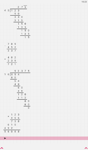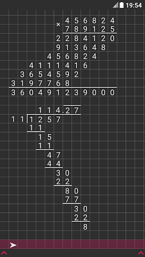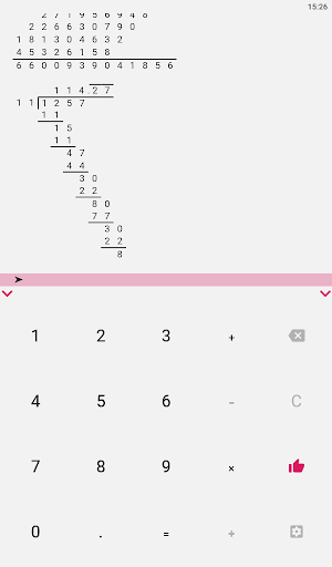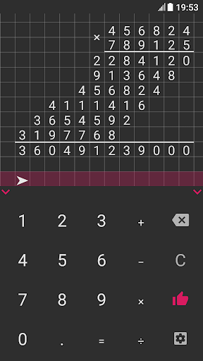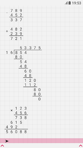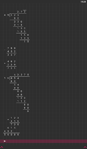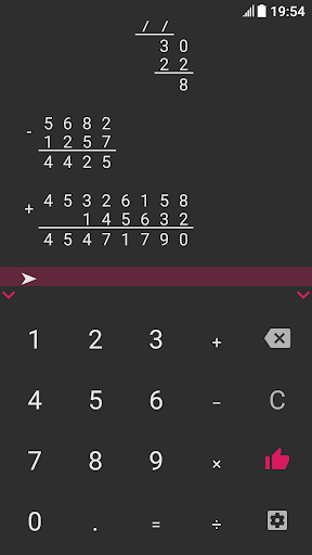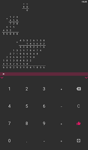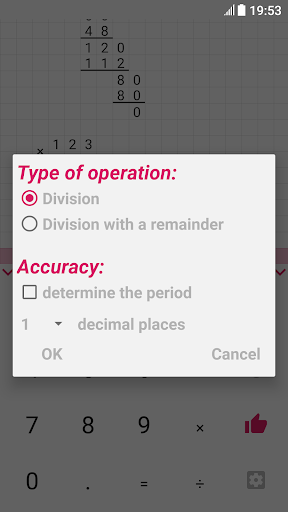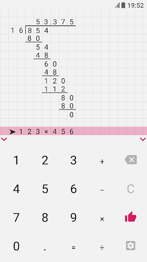 Hi, I'm a long division calculator. I will become your assistant in everyday tasks, such as solving homework. After all, I can produce multiplication, addition, subtraction and division by a column of any numbers in an instant! The task can be entered using the comfortable keyboard, which can be easily hidden for the convenience of viewing the solution. The solution field can be easily scrolled, zoomed in and out, because it stores up to 100 calculations! Any operation supports the input of fractional numbers, and division can determine the frequency of the resulting fractional number, it can also divide the number with a remainder or with an accuracy of 100 decimal places! My options include: