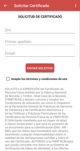 Ứng dụng này hỗ trợ cho người dùng Trong quá trình lấy Giấy chứng nhận kỹ thuật số của các cá nhân chính thức được cơ quan chứng nhận công cộng FNMT (Nhà máy sản xuất vòng và đồng tiền quốc gia), thông qua trụ sở chính thức (xem nguồn).