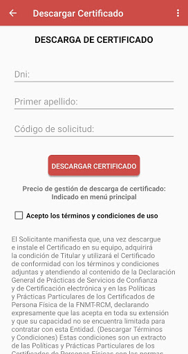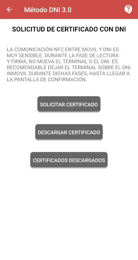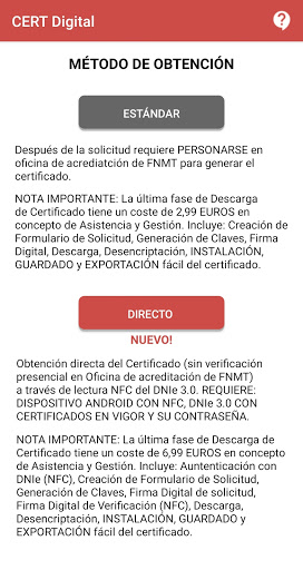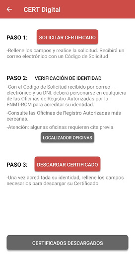 Asistente que permite de forma fácil, sencilla y directa la obtención del certificado digital para personas físicas de FNMT (Fábrica Nacional de Moneda y Timbre) mediante lectura NFC del DNI (Método Directo). En cualquier lugar y en cualquier momento desde su móvil.