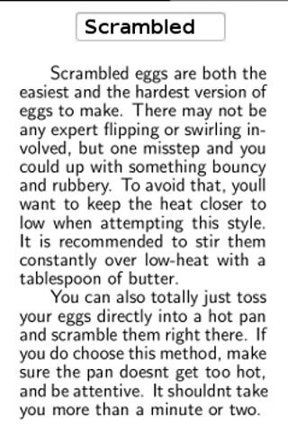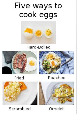 This app contains five recipes for cooking eggs - Hard-Boiled, Fried, Poached, Scrambled and Omelet.