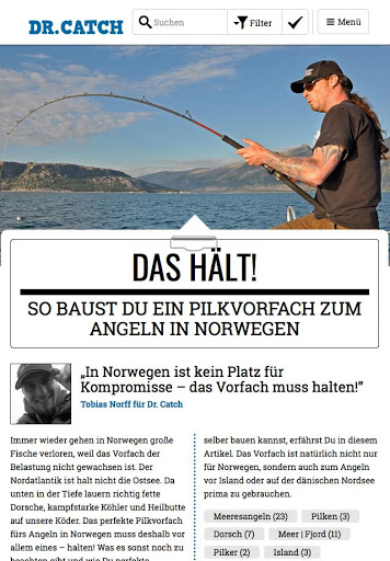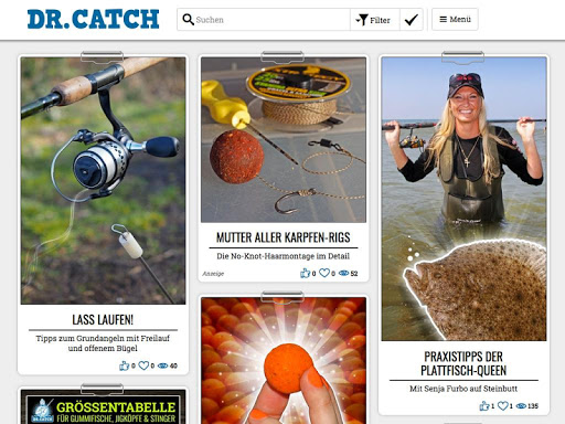 Jede Woche kannst Du Dich auf neue, spannende Berichte rund ums Angeln freuen. Wir benachrichtigen Dich gerne zu Themen, die Dich besonders interessieren – natürlich nur, wenn Du das auch möchtest. Einfache Filterfunktionen machen die Suche nach Angelmethoden, Fischarten, Ködern, Revieren, Knoten und Montagen kinderleicht. Deine Lieblingsartikel kannst Du mit einem Klick als Favorit markieren und so später blitzschnell wieder abrufen. Sogar komplette Filtereinstellungen kannst Du individuell speichern: So bekommst Du nur die Themen angezeigt, die Dich beim Fischen wirklich interessieren. Egal, ob Du Raubfischangler, Meeresangler, Karpfenangler oder Friedfischangler bist oder es Dich eher mit der Fliegenrute an den Bach, die Küste oder den Forellensee zieht – mach Dr. Catch zu Deinem persönlichen Angelmagazin!