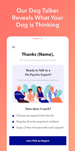 Our Dog Talker app is simple and easy to use. Gain a deeper understanding about your dog’s behavior, thoughts and emotions through animal communication using our expert pet reader. Simply download the app, upload a photo of your dog for our experts, and talk to an online gifted pet psychic and have all your questions answered. Your first 3 minutes are FREE!