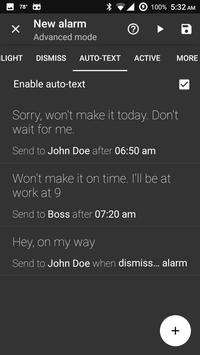 * Set up text messages which will be sent to your contacts if you're not awake by a certain time - e.g. to tell your car pool that they don't need to wait for you if you're not up at 7.00 am and your co-workers or boss that you won't make it on time today if by 8.00 am you're still using the snooze button.