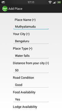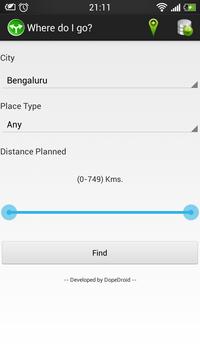 All of you who want to take a break during weekends or holidays, spend a lot of time keep looking up for places. "Where Do I Go?" is the perfect solution for this. With this app you can explore places in and around Karnataka, Andhra Pradesh and Tamil Nadu. You can find the place types like Pilgrims, Hill stations, Rivers, Archeological places, Dams, Bird Sanctuary and may more. This app also gives you information on Food, Lodge Availability and Road Condition of each and every places listed in the app.