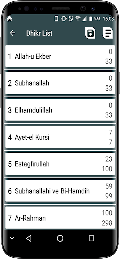 application. You can use the mobile Tasbih & Dhikr counter application for the names of ALLAH (c.c), Salat-ı Tefriciye and for Salaah Tesbihat. Dhikr Counter & Tasbeeh application will record your all dhikrs.