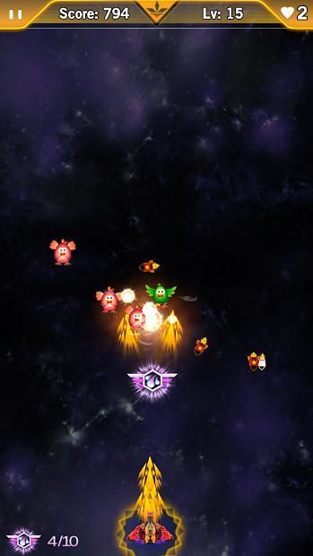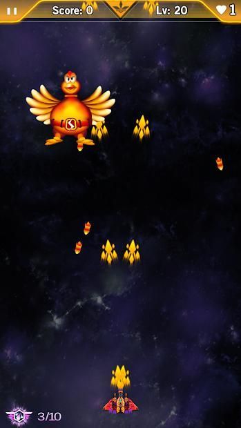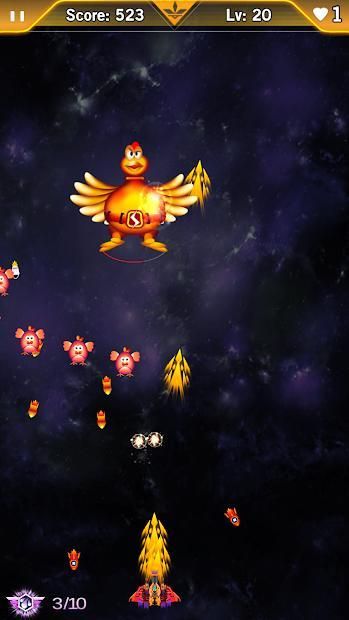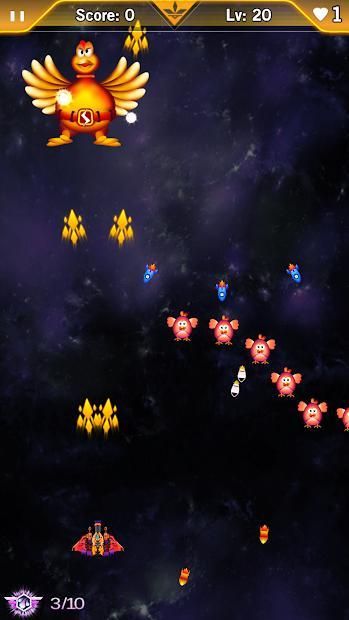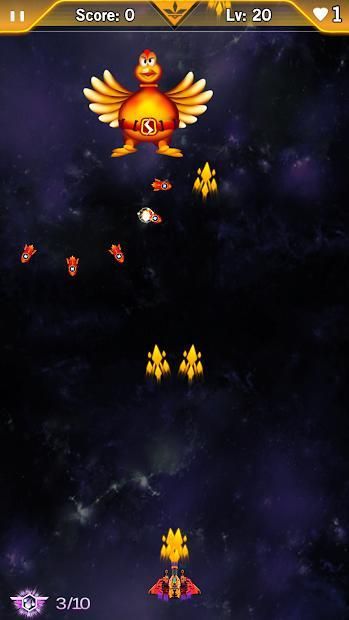 In this "Chicken Invaders: Space Shooting" shooter game, you will be faced with an increasingly large number of projectiles and enemies. As the game progresses, you will earn the right to upgrade your spacecraft to bring it to full dangerous capacity. Press screen to move, destroy enemies in your adventure!