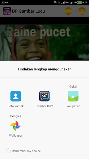 ni adalah merupakan salah satu aplikasi yang mana dapat membantu anda dalam menukar DP pada telefon bimbit anda. di dalam aplikasi ini boleh didapati banyak sekali pilihan gambar lucu yang boleh anda pilih untuk anda jadikan sebagai DP pada telefon mudah alih anda atau boleh anda hantar gambar tersebut kepada rakan-rakan anda dengan melalu butang share pada bahagian atas kanan. gambar yang ada pada aplikasi ini juga boleh anda muat turun degan cara menekan tombul unduh pada bahagian kanan atas yang bersebelahan dengan butang share. cara menggunakannya pun sangat mudah.