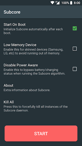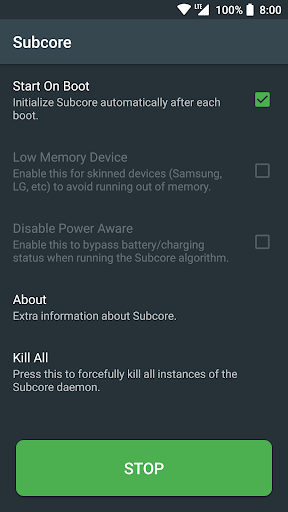 Since Subcore is a low-level (yet userspace) tool, it has direct access to battery statistics. When charging (and screen on), Subcore will boost your performance to the highest performing profile to ensure the user experiences UI/UX conformity, disregarding the energy limitation. Additionally, when Subcore detects the device is at 15% battery or less, it will half the loadavg, which means it requires twice as much CPU load to enter the next profile. Likewise, at 5% battery or less, Subcore locks the device into the lowest profile, which is optimized for deep sleep or idle, sacrificing a chunk of performance to battery. This setting can be disabled by toggling "Disable Power Aware" in the Subcore GUI app.