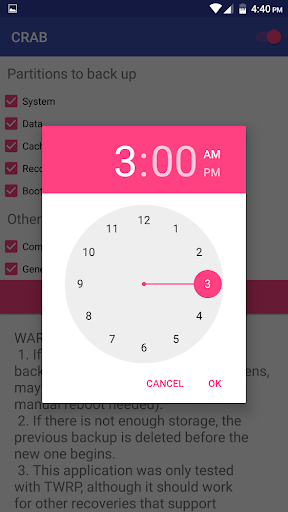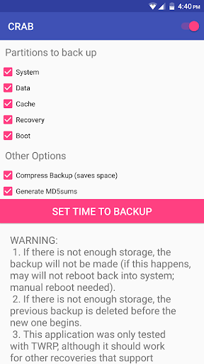 Featured on Android Police, CRAB allows you to schedule a time to back up your device. If you ever damage your device and need a recovery, CRAB will have made one just last night. No longer do you have to manually back up your system!