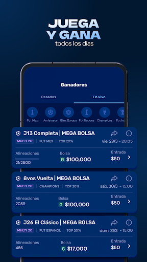 Todos los días puedes draftear a los mejores jugadores, formar equipos imbatibles y ganar dinero real jugando en las mejores ligas de fútbol y con la NFL.