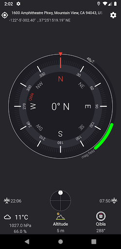 A digital compass, with geographic north, true altitude, address, weather free, sunset and sunrise times