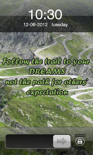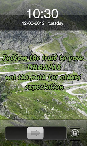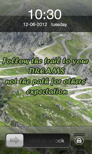 Chase Your Dreams IPhone 4S LockerThis is a custom lockscreen app with beautiful image of a nature . This application makes your android phone look similar to iphone products locker like ipad and iphones.Note for the app to work correctly you must have golauncher and golocker installed on your android phone.The main theme of the locker is the motivational quote written on it. The quote says that we should struggle very hard to achieve our dreams. Motive of achieving our dreams should not only due to other39;s expectation but we should struggle hard to get our dreams fulfilled. Thus motive of achieving our goal should be very clear.Do download this motivation application if you want to get a daily dose ofgood quotes to inspire and full a new zest in your life.Features:Beautiful HD wallpaper images Matching slidersThis theme doesn39;t need ADW or Magic Locker to work; you only need to Go Launcher EX Locker to get this app working. You can also download our other go locker themes with more beautiful backgrounds and more inspirational quotes. Important instruction: GO Launcher EX V2.67 or above and GO Locker v1.05 should be installed on your phone to get this lock screen theme app working. Stay updated as we add more Go Locker wallpaper themes to the android market for better customization of your phone that comprises of locker screens for lovers, fathers, and other relationships.The lock screens has been tested extensively on various mobile models comprising Motorola droid and defy, various models of Samsung Galaxy, HTC wildfire and one v, Sony ericcson Xperia. Resolutions tested : 240320 , 320480,480800, 480854. The application is not designed for tablets.USE INSTRUCTIONS:1. Go to MENUgt;Preferencesgt;Theme Settingsgt;GO Locker iPhone Lock to choose the theme2. Enable Go Locker from Go Locker settings3. Exit the app.If you have some improvements, then please write to us. The locker screen is ad supported. Tags: chasing your dream, always chase your dreams,chase your dreams quotes, golocker, locker theme, locker, motivation, quote, inspiring quote, Iphone 4s Locker.