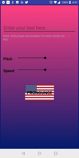 This app demonstrates how to pronounce any text of any length which is entered by the user, in original American(US) accent. Users can type or copy paste any text and simply click on the pronounce button, and then the app will speak out the text.