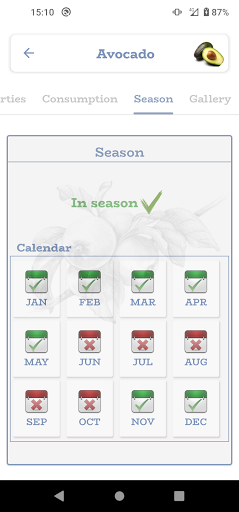 The App includes for each fruit, information about its Characteristics, Properties, Consumption, its period of season and various photos.