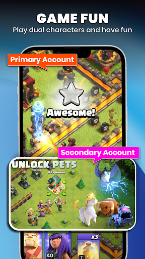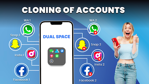 Dual space Multiple Accounts cloning app has a function of appclone, it takes multi social apps and via free app cloner i.e. a super cloner, clone games & clone app. Dual space free contains extra space storage plus to maintain and run multi accounts in Parallel. App cloner takes social media applications, app duplicator creates app clone & puts dual account in second space of multiapp.