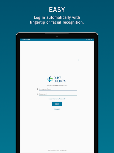• Easy log in. Using your Duke Energy account, you’ll be able to log in once and have options to set up either fingerprint to easily access your account.