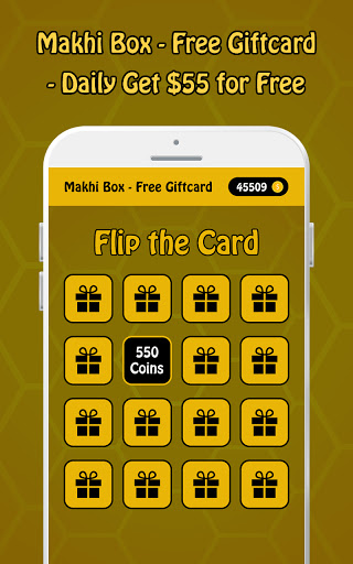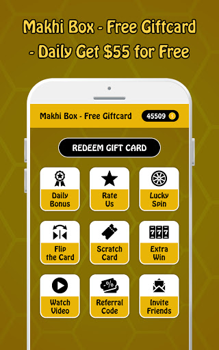 Makhi Box - Free Giftcard - Daily Get $55 for Free is easy an application through with you can play at the same time earn some money. now you can earn rewarded spin & scratch card and rewarded points. We have developed exquisite graphical design for optimum user experience. In our app, you can try your luck by Scratching Gift Cards, Lucky Spin Number, Flip the Cards, Spin the wheel and lots more.