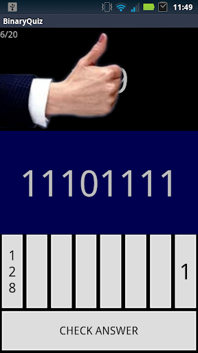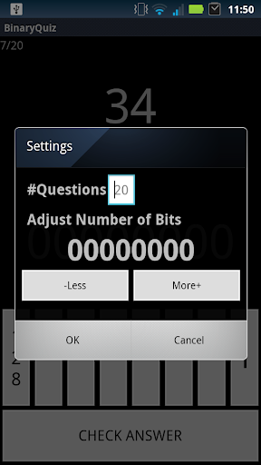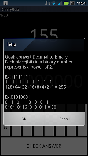 The app randomly generates a set of decimal numbers for you to attempt to convert to binary.