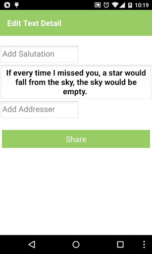 Hundred of love messages to share with your dear. Messages can be edited by users and users may put salutation and addresser when sharing the love messages through text messaging applications.