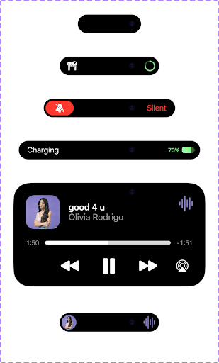 Dynamic Island For Android is an application that you can use to import the Phone's own design features with a tool as popular as dynamic island. This 'dynamic island' designed by apple essentially consists of an interactive bubble of information that you can access at the top of your smartphone screen. This bubble is completely customizable and can offer you data about the music you are listening to or any other dynamic island notification of interest.