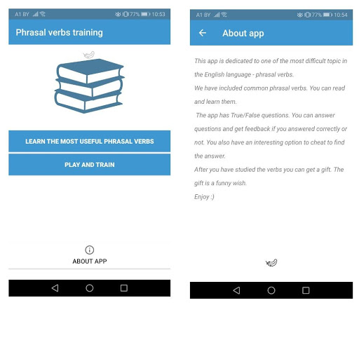 This app is dedicated to one of the most difficult topics in the English language - phrasal verbs. We have included common phrasal verbs. You can read and learn them. The app has True/False questions. You can answer questions and get feedback if you answered correctly or not.