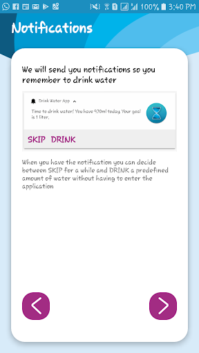 Set a goal, select a time and go! The app will send you notifications so you remember to drink water. A chronometer on the screen will tell you approximately when the next alert arrives.