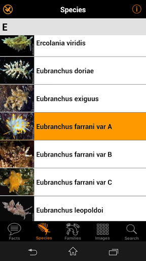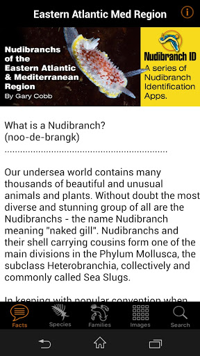 This field guide, which is updated when new names and information are presented, will place right at your fingertips, anytime and anywhere, the most comprehensive collection of all the known Nudibranch species to be found in Eastern Atlantic and Mediterranean waters. There are 723 species including color variations, from Norway and the Barents Sea down to the southern tip of Africa including the Mediterranean Sea. This is an area where marine fauna diversity ranges from tropical to lower temperate species. No web connection required.