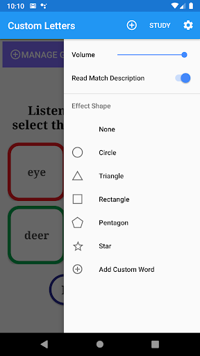 Listen to the sound and select the appropriate letter. 1. Consonant 2. Vowel 3. Word 4. Custom Word