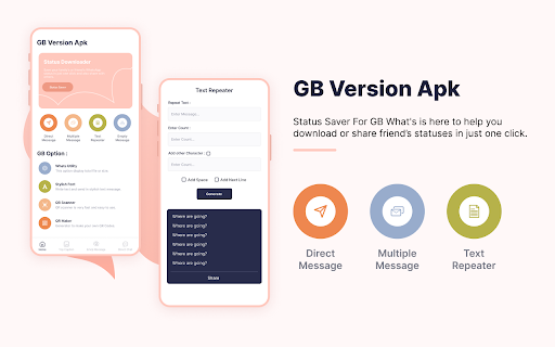 Status Saver and app For GB What's is here to help you download or share friend’s statuses in just one click. You can save your desired image or video statues in your gallery or you can share with friends directly within the GB What's status app. GB What's status saver has its own media player so you can play your desired video status within app and also download or share those videos with friends. You don’t need internet to use GB What's status saver app it is totally offline.