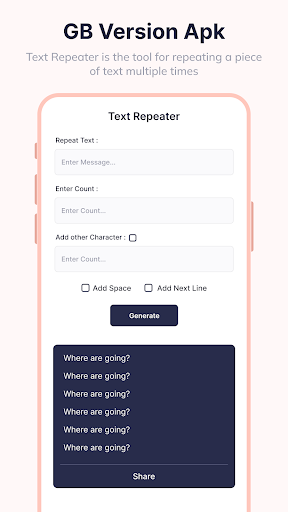 - Text repeater: repeat text message to multiple rows in a second and share with WhatsApp.