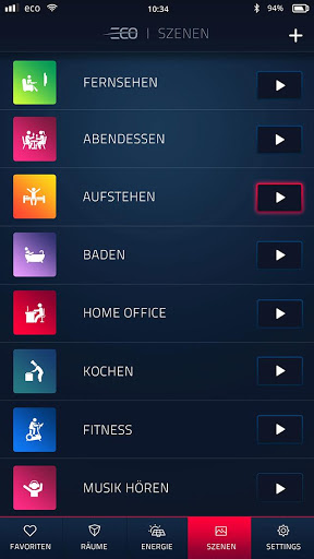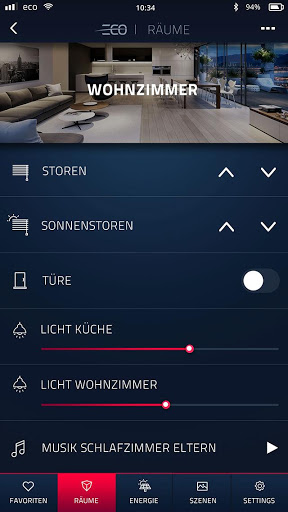 Im Voraus gespeicherte Szenen rufen die bevorzugten Wohnungseinstellungen bequem ab. Für den gemütlichen Filmabend ist es so möglich, die Jalousien runterzufahren, das Licht zu dimmen und den Fernseher einzuschalten – alles mit einem Klick.