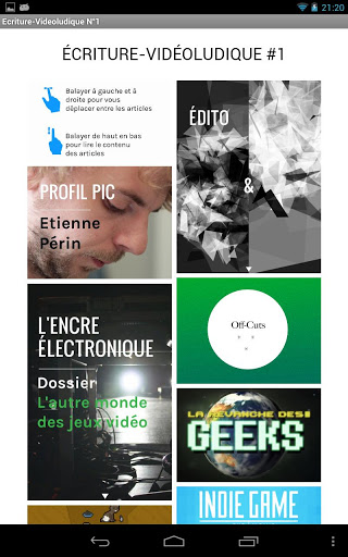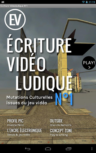 Tous les trois mois, Écriture-Vidéoludique se veut le réceptacle des expériences les plus originales, les plus décalées et les plus subtiles au sujet du jeu vidéo : textes, articles, fictions, portraits, reportages vidéo et créations graphiques. Vous allez découvrir une vision mutante du jeu vidéo qui se construit en collaboration avec les domaines de l'art contemporain, du graphisme, de la littérature et bien entendu du jeu vidéo.