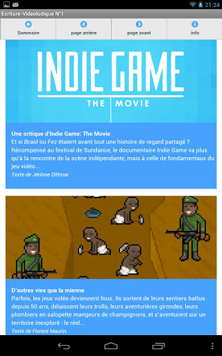 Nous avons voulu avec ce premier numéro questionner le rapport entre la forme documentaire et le jeu vidéo. Pour cette thématique au cœur de la revue dans le dossier l'Encre Électronique, nous avons choisi de limiter les points de vue en fonction de 4 axes, définis par 4 collaborations. Avec pour ligne de mire le récent documentaire Indie Game : The Movie, nous nous sommes demandé comment le jeu vidéo pouvait aborder notre réel par le biais d'éléments comme le film, la photographie ou encore des jeux-documentaires.