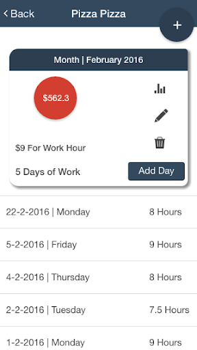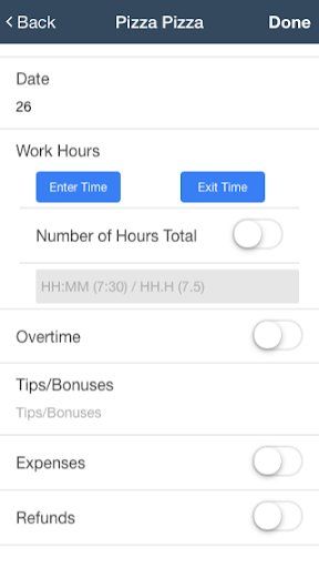 In each day of work you enter the number of hours you worked in this day and how many tips/bonuses you earned, how many expenses you had this day (pay for food / travel / etc..)