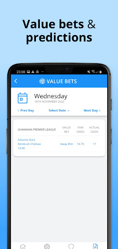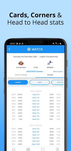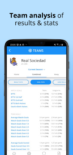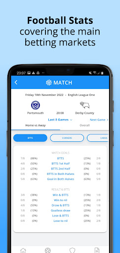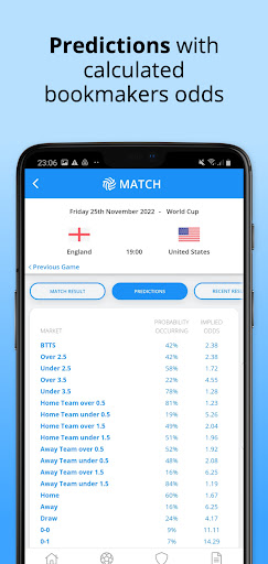 The app includes statistical predictions of the outcomes in the key betting markets. The predictions are a good starting point to research a game.
