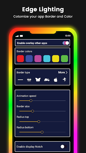 EDGE lighting application use for all Android Devices. This edge light application add all awesome curved rounded corners light border on your device home screen as well as lock screen. You can customize your app border according to your own choice in the application setting. You can change the edge lighting border color and design as well as speed of the lighting. We can also change notch display setting in edge lighting. Edge lighting is supportable for all types of screen in android devices. Lighting for screen infinity U shape and infinity V shape as well as infinity O type.