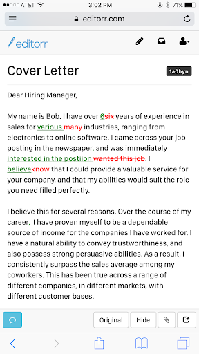 Catch writing mistakes that automated tools do not. We use real qualified editors to check your writing fast. Using the editorr mobile app, users can submit their written text and get instant feedback and real-time corrections. In addition, they can collaborate with an assigned proofreader via instant messenger to ensure their message is not “lost in translation.”