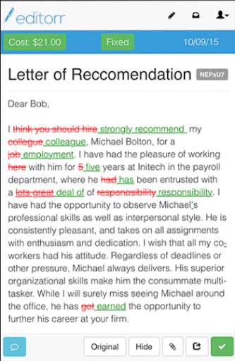 Although our app is a free download, editorr is not a free service. editorr uses real human beings to proofread and edit your written content, 24 hours a day, seven days a week, worldwide. We offer a variety of pricing options for your convenience, starting at $5. The more words you buy, the cheaper your cost is, per word.