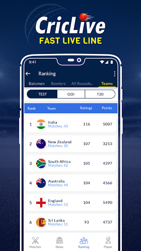 In this app we have also provided the International rankings of the players & teams. You can check various rankings format wise and style wise too.