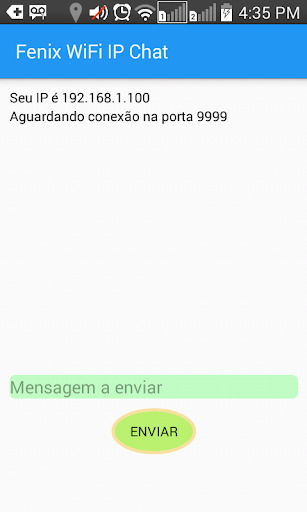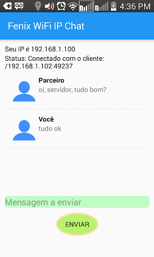 Aplicativo que permite a realização de conversas (chat) entre celulares Android por meio da rede Wifi. Para que o chat comece, um celular deve ser o servidor (criará a conexão) e o outro celular será o cliente (pedirá a conexão ao servidor). Basta ter os dados do IP e porta para configurar a conexão.