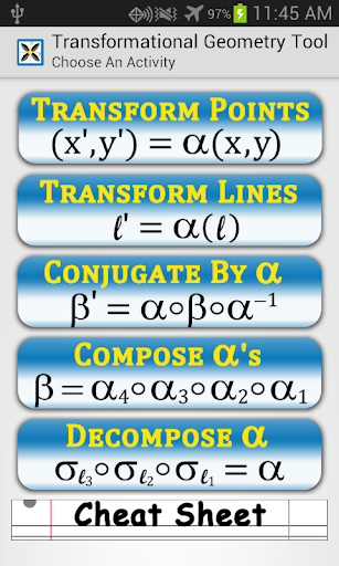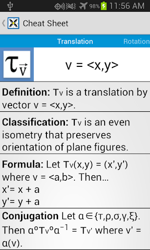 The app also features a "Cheat Sheet" activity to help you learn definitions, formulas, and transformation properties.