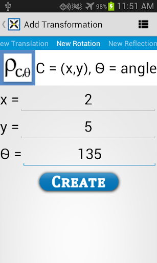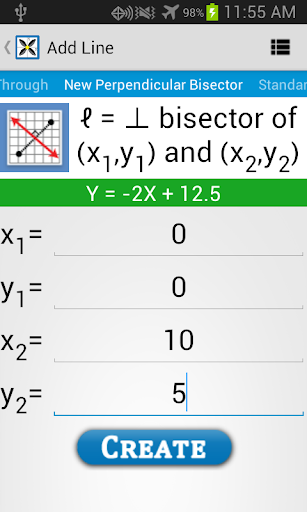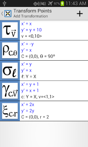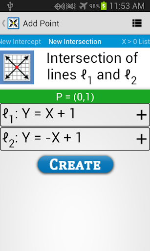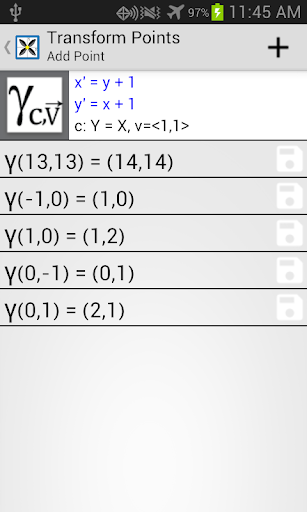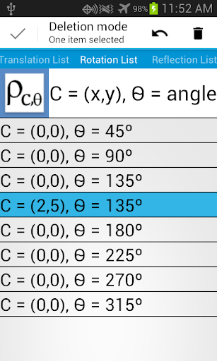 The app saves all of your points, lines, and transformations to a list so you can reuse them. Your calculations will also be saved, and you can delete items from a list at any time.